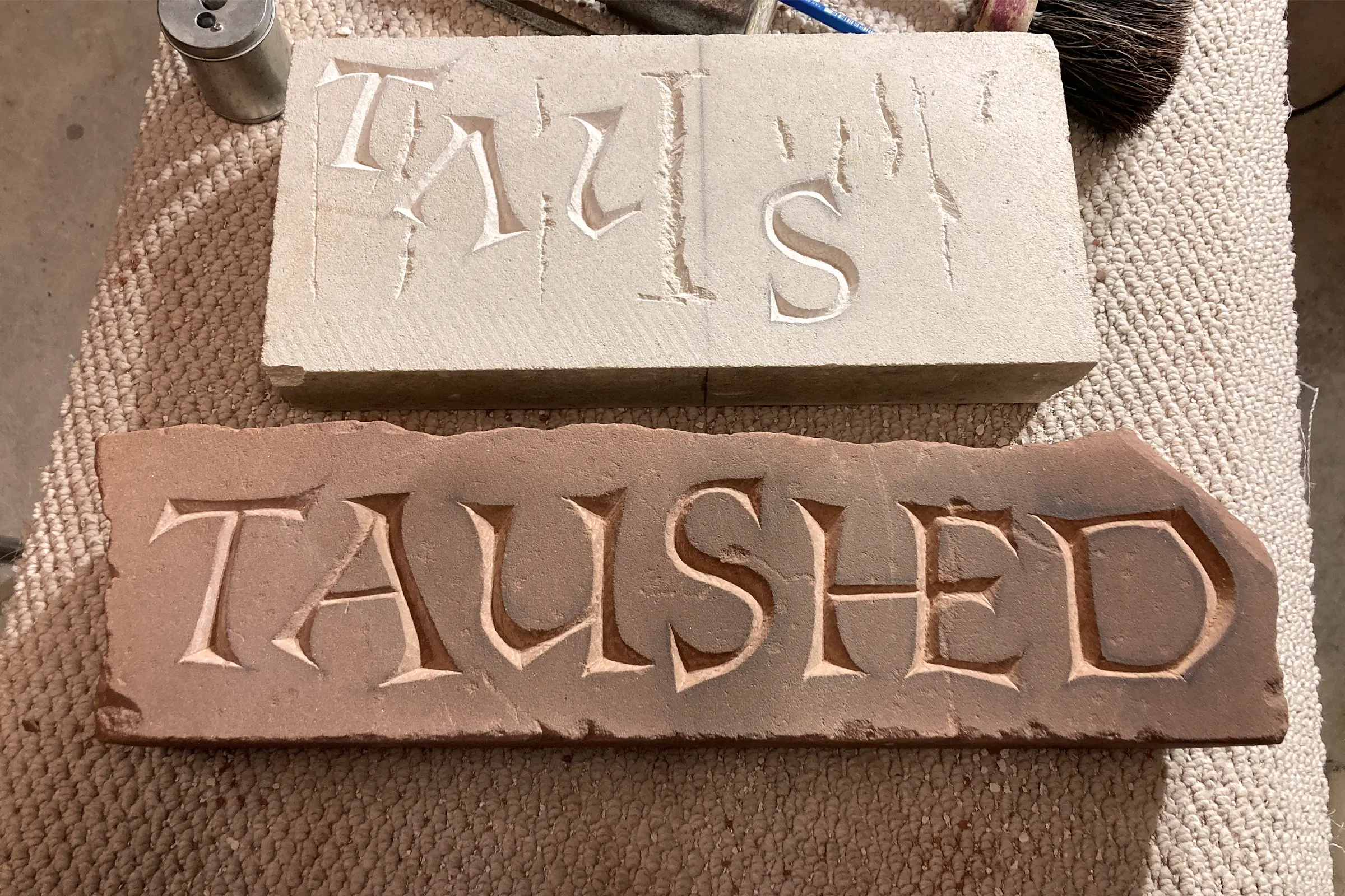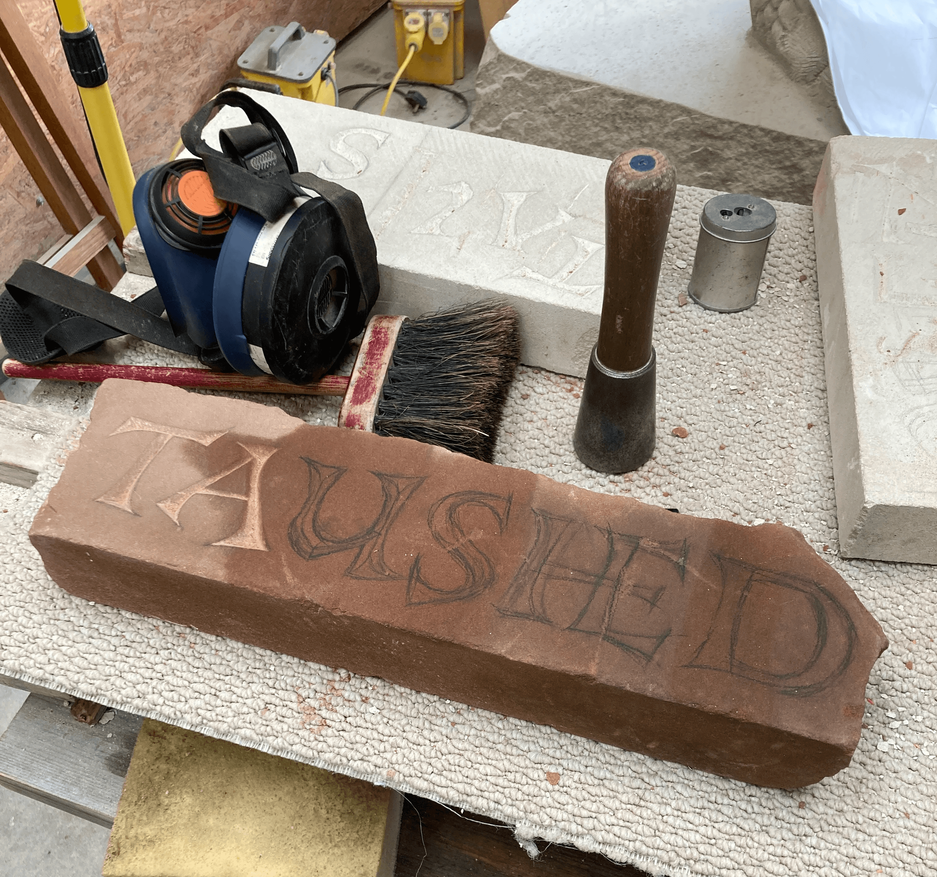 Thanks to Josephine Crossland and Jack Handscombe, I’ve been afforded an informal apprenticeship in letter-cutting; transferring my skills in the lettering arts onto stone. It’s been incredibly enriching seeing firsthand a memorial mason’s pragmatic and physical approach to letter design; the antithesis of the training I’ve received in type design. The v-cut and the material itself nudges and necessitates specific treatments of serifs and stem connections. I can’t imagine a better way to while away ones hours, than to the rhythm of the chisel clinking against stone.